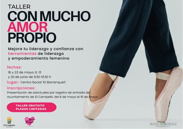 “Con mucho amor propio” es el título que se ha dado a un taller que, dirigido a mejorar la confianza de las mujeres con herramientas de liderazgo y empoderamiento femenino, impartirá en El Campello Silvia Idriasola, experta en liderazgo femenino, los días 16 y 23 de mayo y 6, 13 y 20 de junio. Para participar se abre un plazo de inscripción que va del 6 al 10 de mayo.