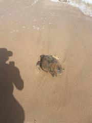 Un ejemplar de tortuga “Caretta Caretta”, comúnmente conocida como “Tortuga Boba”, sorprendió hace unos días a los socorristas y los escasos usuarios de ese día en la playa de Muchavista, donde ondeaba bandera roja ante el fuerte oleaje. El animal optó por refugiarse en el arenal hasta que pasara la tormenta, y una vez pasada se adentró en el mar para continuar su viaje.