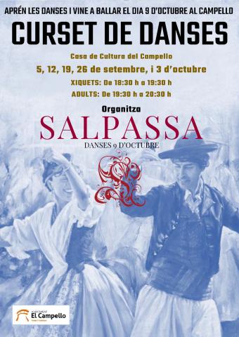 Con la colaboración de la concejalía de Fiestas y Tradiciones que dirige Marisa Navarro, los días 5, 12, 19 y 26 de septiembre y 3 de octubre (todos ellos jueves), en las instalaciones de la Casa de Cultura de El Campello se desarrollará un curso de aprendizaje de danzas populares, organizado por el Grup Salpassa, para fomentar la participación popular en los actos organizados para la festividad el 9 d’Octubre, Día de la Comunidad Valenciana.