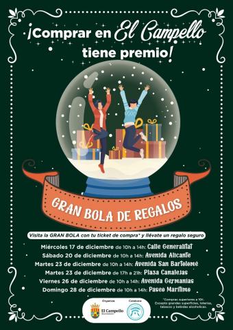 Una gran bola de Navidad transparente, instalada sobre una plataforma móvil y transportada por un vehículo, recorrerá distintos puntos de la localidad. Las personas que realicen compras superiores a 10 euros en los comercios de El Campello podrán participar y optar a un regalo, fomentando así el consumo en los establecimientos locales.